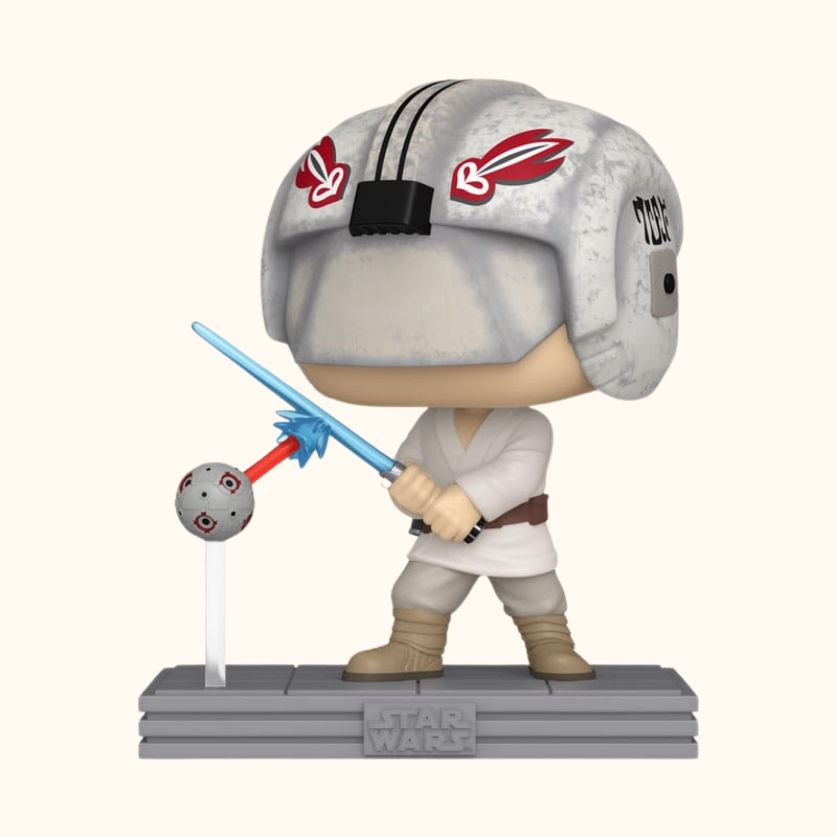 This meticulously detailed Funko POP! vinyl figure depicts Luke Skywalker from Star Wars: Episode IV – A New Hope , blindfolded and completing the iconic lightsaber training. The helmet, lightsaber, and floating remote make this figure a nostalgic highlight.