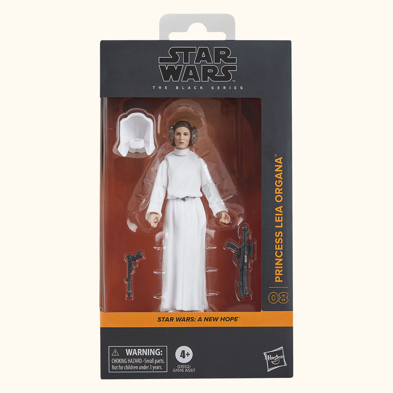 Now available as a detailed 15 cm scale figure from the Black Series! The figure features Leia in her white look from Episode IV: A New Hope , including a cowl, DL-44 blaster, and E-11 blaster. Ideal for fans who want to add a piece of galactic history to their collection—whether for play or display.